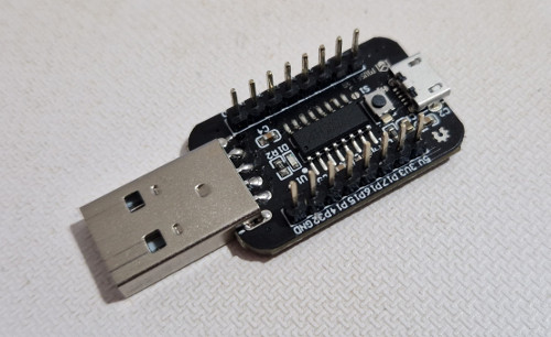 Este microcontrolador está basado en un núcleo compatible MCS51 (8051) y, además de los periféricos estándar del 8051, dispone de una interfaz USB full-speed (12 Mbps) que sirve, además. como interfaz para tostar el integrado. Para desarrollar este pequeño proyecto utilizaremos una de las muchas placas disponibles en AliExpress que contienen este microcontrolador. Son placas muy baratas (muchas de menos de 2 ¤) y, para nuestro caso, sólo será necesaria una que incluya, como mínimo:
