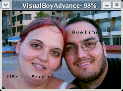 que permite escribir una cadena de texto en la pantalla en modo gráfico 4. La fuente la convertí a mano usando el GIMP con una fuente gratuita de las que hay a millones por internet y luego convertí la imagen plana a formato .h de 1 bit (fichero 8x8font.h). Aquí tienen una captura de la ejecución del ejemplo en el emulador de Gameboy Advance, VisualBoyAdvance: