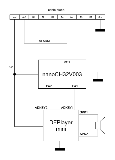 Toda la circuitería del reloj despertador y del DFPlayer Mini funciona con 5 voltios, pero el CH32V003 funciona con 3.3 voltios. En este caso se utiliza una placa "nanoCH32V003" para que pueda alimentarse a 5 voltios de la propia fuente del reloj despertador. El cable de alarma se conecta a PC1 o a cualquier otra entrada del CH32V003 siempre y cuando sea un pin tolerante a 5 voltios (no todos los pines de ese microcontrolador lo son).