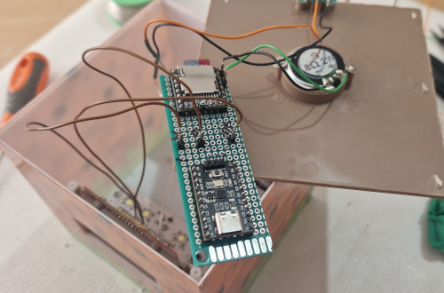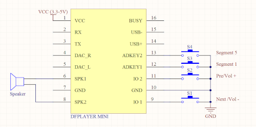El DFPlayer Mini es un módulo de reproducción de MP3 que incluye lector de tarjeta de memoria microSD. Dispone de dos pines dedicados (ADKEY1 y ADKEY2) que, cuando se ponen a masa reproducen, respectivamente, el primer y el quinto MP3 de la tarjeta de memoria. El módulo carece de pines para detener la reproducción pero, como en este caso sólo se precisa que hayan único sonido, se opta por una solución simple: