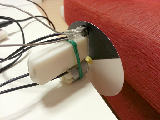 La velocidad se lee mediante un sencillo encoder compuesto por un disco pintado mitad de blanco y mitad de negro y por un sensor infrarrojo de tipo reflexivo (el CNY70, de los que suelen usarse en robots siguelineas).