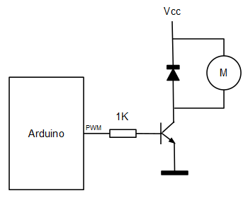 El motor es accionado a través de una de las salidas PWM del microcontrolador mediante un transistor NPN de potencia.
