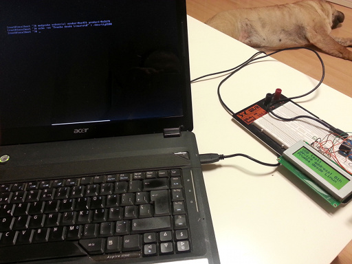 echo -en "Prueba desde Linux\n\0" > /dev/ttyUSB03. Voilà: