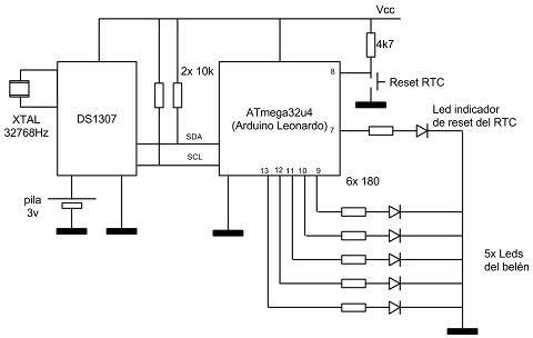 - Y finalmente tenemos un pulsador y un led adicional etiquetados como “Reset RTC” y “Led indicador de reset del RTC” respectivamente. El pulsador sirve para reiniciar la hora del RTC a las 00:00 (para ponerlo en hora, vamos) y el led indica que se ha puesto en hora de forma satisfactoria. Este último led se deja en la misma placa, no forma parte de las luces parpadeantes del belén. Para evitar que pulsaciones accidentales cambien la hora del chip RTC, es necesario mantener pulsado el botón al menos 2 segundos para que tenga efecto.