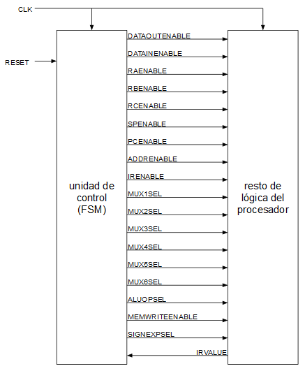 Como se vio en la primera entrega, la unidad de control es realmente una FSM (máquina de estados finita) cuyas salidas gobiernan las entradas “enable” de los registros, las entradas de selección de los multiplexores y el resto de la lógica del procesador.