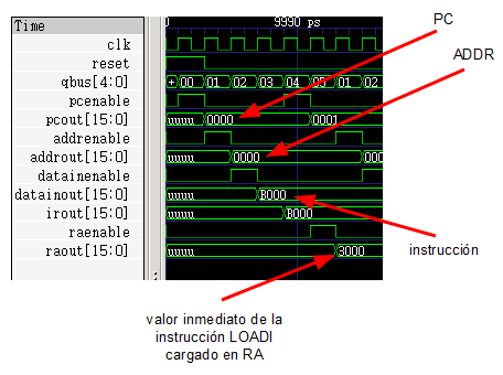 A continuación pueden verse las señales de nuestra CPU al ejecutar una instrucción LOADI justo después del reset: