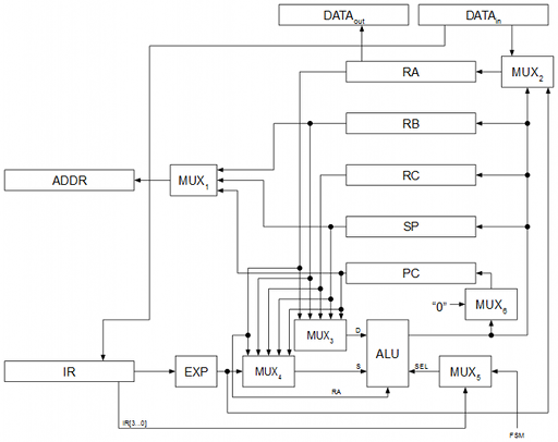 - 5 registros de 16 bits con signo (RA, RB, RC, SP y PC) entre los que se incluyen el puntero de pila (SP) y el contador de programa (PC).