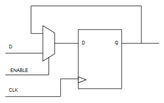 La forma más portable de implementar una entrada “enable” es poniendo un multiplexor en la entrada D que seleccione entre la entrada exterior y realimentar la propia Q. De esta forma simulamos un “enable” con lógica “estándar”.