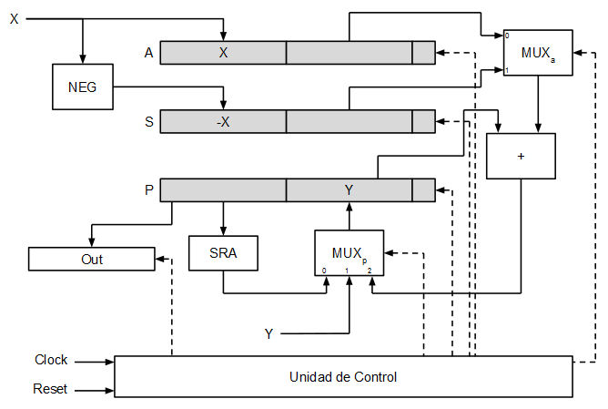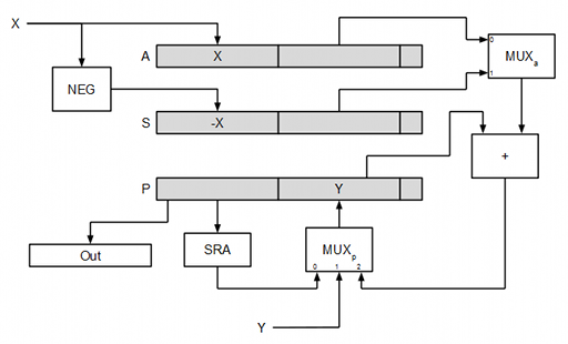 En la Wikipedia hay una explicación muy clara y detallada del algoritmo de Booth (https://es.wikipedia.org/wiki/Algoritmo_de_Booth). En este caso se ha asumido, por simplicidad, que ambos términos (multiplicando y multiplicador) tienen la misma cantidad de bits.