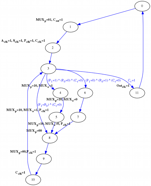 A partir de este algoritmo se puede diseñar la siguiente máquina de estados: