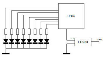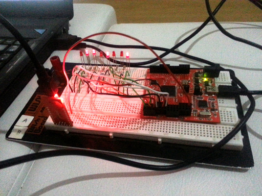 A la placa Papilio One (Xilinx Spartan3E) se le conectó por un lado un array de 8 leds (conectado internamente al registro de salida del módulo receptor de la UART) y, por otro lado un módulo USBSerial basado en el chip FT232R, dicho módulo permite mediante un jumper seleccionar una operación a 3.3V (la FPGA incluida en la placa Papilio One no es tolerante a 5V): Se conectó la salida TX del módulo a un pin de la FPGA conectado internamente a la señal RX del módulo receptor.