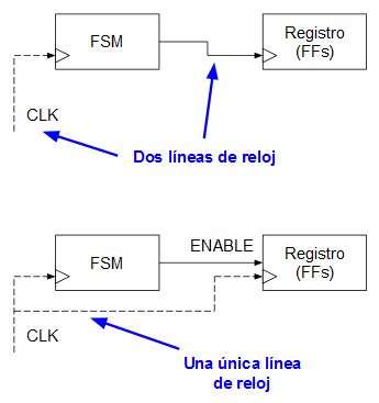 2. Para ASICs el uso de gated clocks mientras sea con cabeza (código gray, one-hot, etc.) no sólo es perfectamente válido, sino hasta aconsejable. Hay que tener en cuenta que una señal de reloj es una enorme fuente de consumo de corriente ya que cada vez que bascula la señal de reloj se producen micropicos de corriente debidos a las capacidades presentes en las entradas de reloj de los biestables a los que ataca. Un circuito con gated clocks consumirá menos corriente que su equivalente sin gated clocks.