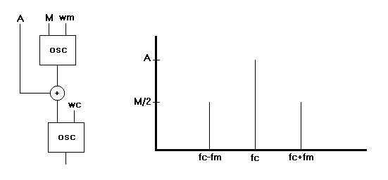 En la síntesis AM la amplitud de una onda modula la amplitud de otra. En términos generales y para ondas senoidales: f(t) = (A + M * cos(wm * t)) * cos(wc * t). Siendo M la amplitud de la moduladora, wm la frecuencia angular de la onda moduladora (m), wc la frecuencia angular de la onda portadora (c = carrier) y A la componente de continua aplicada a la señal moduladora. Cuando A=0 se produce una multiplicación de ambas señales (es lo que se denomina modulación en anillo) mientras que si A>0 se produce una modulación de amplitud normal de la señal del oscilador wc.