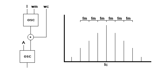 Los otros dos médotos de modulación entre ondas los hemos agrupado ya que en realidad ambos tipos de modulación son muy parecidos desde el punto de vista matemático y los espectros resultantes son prácticamente iguales. En la modulación FM lo que se hace es modular la frecuencia de la onda portadora en función de la amplitud de la onda moduladora. Tenemos por tanto, para señales senoidales: f(t) = A * cos(wc * t + (I * cos(wm * t))). Donde, como en el caso de la AM; wc es la frecuencia angular de la portadora, A es la amplitud de la portadora, I es la amplitud de la moduladora y wm es la frecuencia angular de la onda moduladora. Vemos que si A=1 e I=0 tenemos que f(t) = cos(wc * t). A I también se le denomina "índice de modulación" y viene expresado por I = Δf/fm, siendo Δf el incremento de frecuencia sobre la portadora y fm la frecuencia de la moduladora (al ser w=2·PI·f, I también lo podemos expresar como Δw/wm). El significado de Δf es sencillo: si queremos que una portadora de 300Hz varíe entre 290Hz y 310Hz hacemos Δf=10. En el caso de la síntesis FM se generan parciales por encima y por debajo de la frecuencia de la moduladira fc: fi = fc ± (i * fm) con i = 0..(I+2) aproximadamente. En la realidad se generan infinitas bandas laterales alrededor de fc pero estas bandas se van atenuando a medida que aumenta la i y a partir de i=I+2 la amplitud de éstas es despreciable. La atenuación en estas bandas viene dada por las llamadas funciones de Bessel. Ver la figura 3. El espectro de una onda resultante de una modulación FM es un espectro muchísimo más rico que el que se genera mediante AM ya que, en teoría obtenemos un espectro infinito. La síntesis FM no cobró vida hasta la aparición de los osciladores digitales.