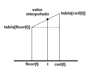 Podemos interpolar de diferentes formas: de forma lineal, cuadrática, cúbica, mediante splines, etc. La interpolación lineal es, sin duda la más utilizada al ser la interpolación que menos tiempo de procesador requiere. Lo único que se hace es imaginar una línea recta entre la muestra conocida inmendiatamente anterior y la muestra conocida inmediatamente posterior y obtener el valor de la muestra interpolada sobre dicha recta (ver la figura 4). En el caso anterior, si tabla[0]=1 y tabla[1]=2, tabla[0.5] lo podemos estimar como 1.5. Por tanto, para interpolar linealmente: valor = tabla[floor(t)] + (t - floor(t)) * (tabla[ceil(t)] - tabla[floor(t)]). Esta ecuación para cuando floor(t) ≠ ceil(t), es decir, para cuando t no sea un valor entero. Cuando t sea un valor entero simplemente valor = tabla[t]. floor() y ceil() son dos funciones de la librería matemática que devuelven el entero más próximo por defecto y el entero más próximo por exceso, respectivamente, del parámetro.
