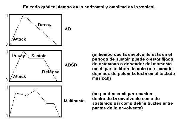 En nuestro caso, una envolvente, será una función e(n) que devuelve un valor normalizado (entre 0 y 1). Existen varios tipos de envolventes: AD (Attack Decay), ADSR (Attack Decay Sustain Release, la más utilizada) y las envolventes multipunto (figura 6).