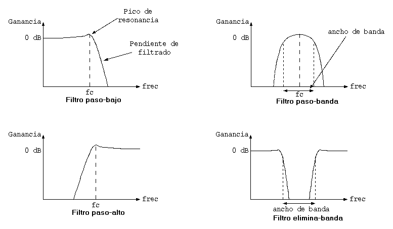Los filtros paso-bajo y paso-alto vienen determinados por la frecuencia de corte y la pendiente de filtrado y los filtros paso-banda y elimina-banda vienen determinados por la frecuencia central de la banda, la anchura de la banda y la pendiente de filtrado a ambos lados de la banda (ver figura 7).