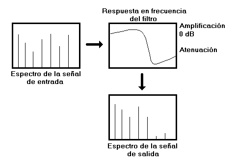 Existen otro tipo de filtros como son los ecualizadores que permiten dar la forma que deseemos a la respuesta en frecuencia (atenuar determinadas frecuencias y amplificar otras que nosotros queramos). El funcionamiento general de un filtro se puede apreciar en la figura 8.