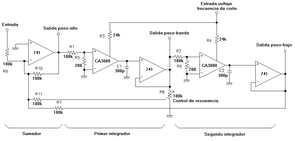 Utilizaremos por ahora el primer método y partiremos de un circuito muy conocido: el filtro de estado variable. En la figura 9 Podemos ver un circuito típico de un filtro de estado variable. Un filtro de estado variable (state variable filter) es un circuito de segundo orden formado por dos integradores y un sumador. En el circuito de la figura cada integrador se monta entorno a un amplificador operacional de trasconductancia (CA3080) y a un amplificador operacional normal de ganancia unidad a modo de separador (741). El sumador se implementa entorno a un amplificador operacional normal (741). Este circuito es muy versátil y posee tres salidas diferentes: una salida paso-alto en el pin de salida del amplificador sumador con una pendiente de filtrado de 12 dB/octava, una salida paso-banda en el pin de salida del primer integrador con una pendiente de 6 dB/octava y una salida paso-bajo en el pin de salida del segundo integrador con una pendiente de filtrado de 12 dB/octava. Todo en un mismo circuito.