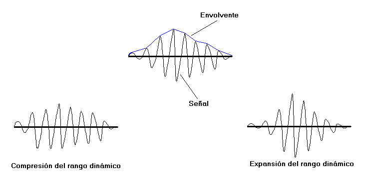 Cuando procesamos el rango dinámico de una señal, en lo que nos fijamos es en su envolvente temporal. La envolvente de una señal la podemos definir como la señal que se formaría si uniésemos los puntos más altos de cada período de onda.
