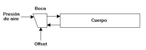 En la figura 2 tenemos de forma esquemática lo que sería un instrumento de viento madera. ¿Por qué madera? Los instrumentos de viento madera tiene como característica principal que el diámetro a lo largo de todo su recorrido permanece constante (o casi), salvo, quizás, la campana, en la que el diámetro normalmente aumenta. El hecho de que el diámetro permanezca casi constante a lo largo de todo el instrumento permite simplificar enormemente la implementación.