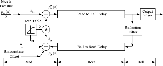 Para sintetizar instrumentos de viento, los registros de desplazamiento que vimos en el caso de la cuerda pulsada, simbolizan ahora el recorrido de la onda a través de todo el tubo del instrumento. Los extremos de los registros de desplazamiento simbolizan los extremos del instrumento (por la boca se aplica presión de aire y la campana sería el otro extremo).