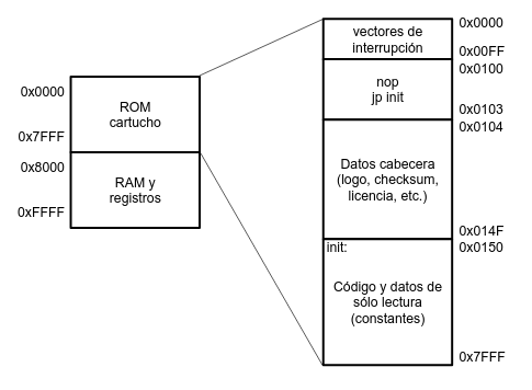 Después de arrancar, la ROM de arranque comprueba el logo y el checksum del cartucho insertado y, si es correcto, salta a la dirección de memoria 0x0100, que es donde debe residir la primera instrucción del cartucho. Como se puede apreciar en la estructura del cartucho, en esta zona apenas caben 4 bytes (a partir de 0x0104 vienen los datos del logo de Nintendo, el nombre del juego, la licencia, el checksum, etc.), por lo que lo habitual es colocar ahí una instrucción de salto hacia una dirección donde esté el resto del código: por ejemplo 0x0150 u otra. Aquí puede verse con detalle todo el mapa de memoria de la GameBoy. La zona de los vectores de interrupción, que está antes de 0x0100, la veremos más adelante, cuando usemos las interrupciones.