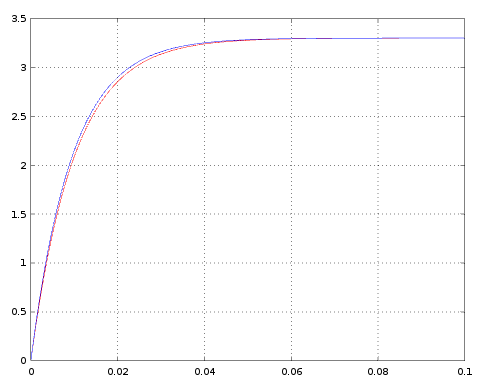 A continuación puede verse un código en lenguaje Octave (software libre de cálculo numérico) que pinta superpuestas las gráficas resultantes de ambas soluciones asumiento con condiciones iniciales nulas ($V_o=0$, i.e. condensador totalmente descargado, en el instante inicial).