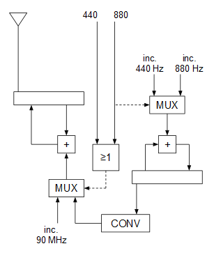 En reposo, las entradas “440” y “880” valen 0, por lo que el MUX inferior selecciona la entrada del incremento correspondiente a los 90 MHz (portadora sin modular). Cuando se pulsa sólo el botón “440” el MUX inferior deja pasar la señal moduladora (ya convertida en secuencias de incrementos en lugar de en 0 y 1) a la entrada del oscilador para modularlo, y cuando se pulsa el botón “880” ocurre lo mismo con el MUX inferior y, además, al cambiar la entrada de selección del MUX superior, cambia el incremento del oscilador que genera la señal moduladora para que genere 880 Hz en lugar de 440 Hz.