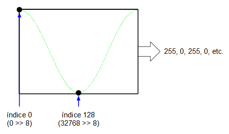 Yéndonos al otro extremo, si en la entrada de 16 bits metemos un valor de $2^{15} = 32768$, el acumulador de fase, al ser de 16 bits, se desbordará cada dos ciclos de reloj: el acumulador de fase generará la secuencia de valores 0, 32768, 0, 32768, 0, 32768, etc. que, a su vez, indexarán los valores mínimo y máximo de la onda senoidal que tenemos en la tabla. Esto significa que la salida del oscilador ha alcanzado su frecuencia máxima (su frecuencia de Nyquist, de 16 KHz).