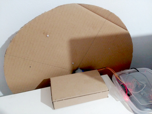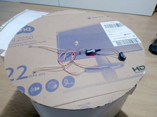 Si sacamos hacia fuera 5 de los 10 bits del registro LFSR (no tienen por qué ser consecutivos) obtendremos un razonable efecto de "cielo estrellado aleatorio" que cambia cada segundo. Ahora podemos colocar todo el montaje en la parte trasera del disco de cartón dejando que se asomen hacia adelante sólo los leds y poniendo en la cara no visible la plaquita con el CLPD y la pila de botón.