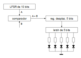 Para generar una secuencia de números pseudoaleatorios la forma más sencilla es utilizar un LFSR con la cantidad suficiente de bits como para dar la percepción de que se trata de un generador de números realmente aleatorios. Si partimos de un LFSR de 10 bits, para que sea maximal (que su secuencia numérica sea lo más larga posible antes de “dar la vuelta”) debemos implementar el siguiente polinomio de realimentación: