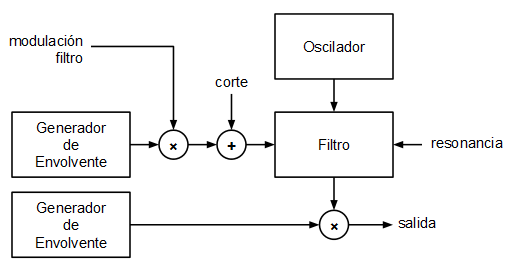 Se utilizan dos generadores de envolvente independientes. Uno que modula la frecuencia de corte del filtro y otro que modula la amplitud del sonido final, antes de escribirlo en el DAC. El tipo de envolvente más común y el que se ha utilizado en este caso es el tipo ADSR (Attack-Decay-Sustain-Release). Cada envolvente de este tipo posee tres valores característicos: el tiempo de ataque (A), el tiempo de caída (D), el nivel de sostenido (S) y el tiempo de liberación (R). Se puede ver un generador de envolvente como una generador de una señal muy lenta que varía entre 0 y 1.