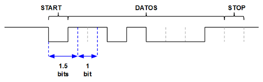 Que, redondeando, nos da: 3333 pulsos a 32MHz por bit a 9600 bps. Multiplicando por 1.5 nos dará la cantidad de pulsos a 32MHz necesarios para contar 1.5 bits de tiempo: