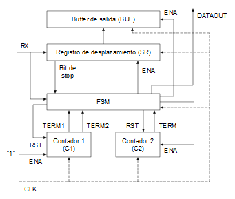 - Una máquina de estados (FSM, Finite-State Machine) encargada del control de los contadores, del registro de desplazamiento y del registro de salida.