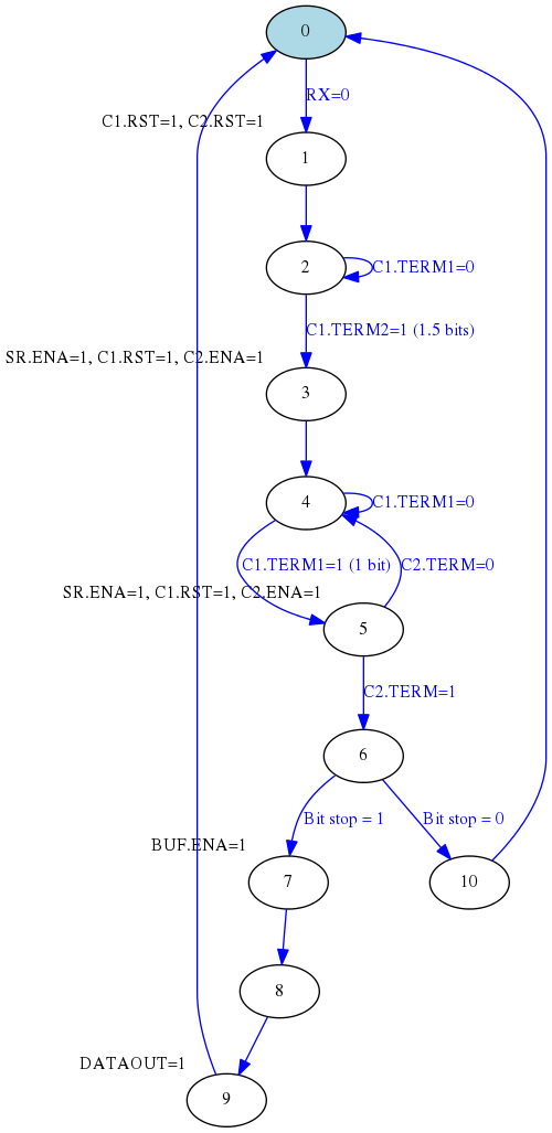 La máquina de estados es una versión “formal” del algoritmo descrito en párrafos anteriores. Como se puede apreciar el contador 1 se utiliza para controlar los tiempos entre los principales cambios de estado (cuando se detecta el bit de start y entre bit y bit de datos).
