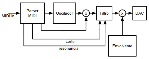 ( 3 / 11480 )Partiendo del montaje realizado en el post anterior, se han realizado varias modificaciones y mejoras. El parser MIDI de esta segunda iteración genera ahora 3 señales de control, de 7 bits cada una, que se utilizan para controlar la frecuencia de corte, la resonancia y la ganancia de la entrada de un filtro paso bajo de segundo orden: