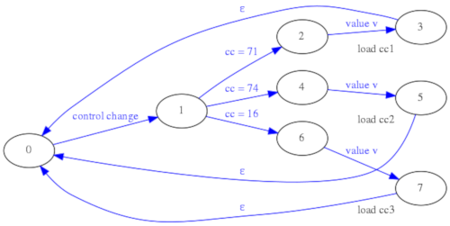 Con la anterior versión del parser, que asumía que un noteOff se correspondía siempre con el noteOn inmediatamente anterior, lo que ocurría era que cuando al sinte le llegaba el noteOff(La) callaba la nota Mi disparada justo antes porque asumía que ese noteOff se correspondía con dicha nota Mi. En la nueva versión del parse este noteOff(Mi) es ignorado por la máquina de estados por lo que la respuesta del sintetizador es más natural.