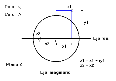 Además de la ubicación de los ceros y los polos tenemos un elemento esencial dentro del plano complejo: la circunferencia goniométrica (una circunferencia con centro en el origen y de radio = 1). El comportamiento del sistema y el filtrado de frecuencias vendrá dado por la posición de los ceros y los polos con respecto a esta circunferencia.