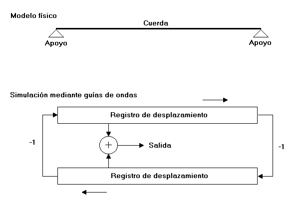 Para sintetizar instrumentos de viento, los registros de desplazamiento que vimos en el caso de la cuerda pulsada, simbolizan ahora el recorrido de la onda a través de todo el tubo del instrumento. Los extremos de los registros de desplazamiento simbolizan los extremos del instrumento (por la boca se aplica presión de aire y la campana sería el otro extremo).
