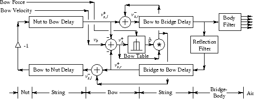 Hasta aquí todo igual que en el caso de la cuerda pulsada. La perturbación que provoca el arco se simula, cómo no, con una función de dispersión que, normalmente se hace no lineal y cuyos parámetros vienen determinados por la velocidad y la presión que genera el arco del instrumento. En la figura 5 podemos ver un esquema de lo que sería un instrumento de cuerda frotada y su implementación mediante guías de onda.