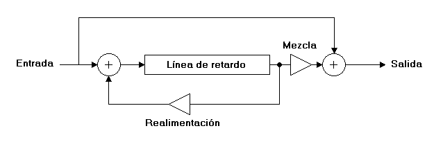 Este tipo de procesamiento es uno de los más simples y se basa en el uso de una línea de retardo de duración constante y realimentada que provoca ecos equiespaciados en el tiempo. La señal de entrada entra en la línea de retardo y, a la salida de esta línea, la señal retardada se mezcla con la señal de entrada para generar la salida del delay. Normalmente se añade un control de realimentación que permite producir más de un retardo. Supongamos que la función de la línea de retardo es y = R(x), siendo x la señal que le entra e y la señal que sale. Para un delay tendremos dos ecuaciones: y = x + MEZCLA·R(z), z = x + REALIMENTACIÓN·R(z) siendo, en este caso x la entrada del delay e y la salida del delay (ver figura 6). Como se puede comprobar si MEZCLA=0 la salida del delay es igual que la entrada, sin eco, mientras que con MEZCLA=1 el primer eco tendrá la misma amplitud que la señal inicial. Si REALIMENTACIÓN=0 se produce un solo eco, mientras que con REALIMENTACIÓN=1 se produce una realimentación total (infinitos ecos). Una valor 0 < REALIMENTACIÓN < 1 provoca ecos equiespaciados que tardan en extinguirse un tiempo proporcional al valor de REALIMENTACIÓN.