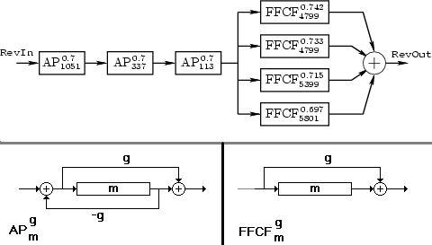 Un filtro peine con realimentación hacia delante (feedforward) se puede definir matemáticamente como: yt = Rm(x) + g·x. Siendo b = Rm(a) una línea de retardo de m muestras de longitud con entrada a y salida b, x la entrada del filtro, y la salida del filtro y g una constante. Un filtro paso-todo es algo más complejo y se define matemáticamente como: y = g·w + Rm(w) con w = x - g·Rm(w) (w es la señal de entrada de la línea de retardo y el resto de letras tiene el mismo significado que en la ecuación del filtro peine).