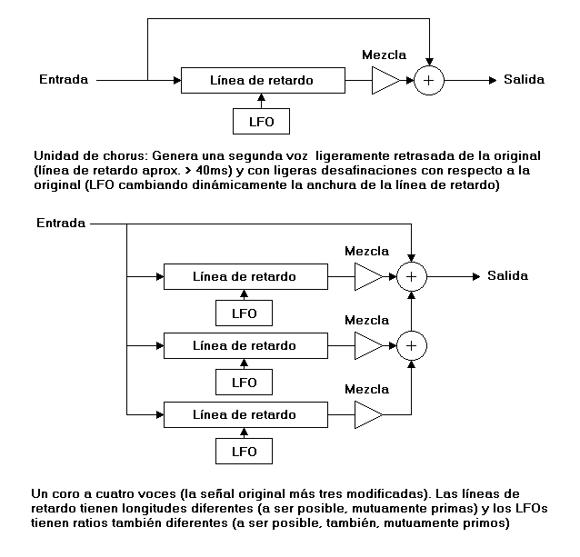 La implementación digital de un chorus es muy sencilla. Si tenemos una línea de retardo como en el caso del delay, con y = R(x); lo que tenemos es: s = e + MEZCLA · R(e). Siendo e la entrada de audio, s la salida y MEZCLA un valor entre 0 y 1 que determina la mezcla de la señal original y la retardada. Hasta aquí lo que tenemos simplemente es una especia de delay sin relimentación. La diferencia estriba en la línea de retardo. En este caso, está gobernada por un LFO, mediante el cual variamos la longitud, en muestras, de la línea.